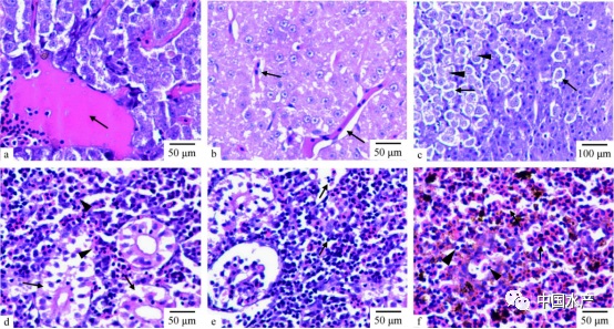 利用组织病理学对感染嗜水气单胞菌病斑点叉尾鮰的组织病理损伤进观察。结果显示,肝小叶中央静脉淤血(图3a);肝血窦受压,体积缩小,狄氏间隙明显增宽(图3b);肝细胞肿胀,广泛性颗粒变性、空泡变性,局灶性肝细胞溶解,结构均质化,部分肝小叶出现坏死灶(图3c);肾小管上皮广泛性颗粒与空泡变性,其间发生坏死、脱落,整个肾小管结构坏死(图3d);肾间质淤血、出血,组织增生,大量淋巴细胞浸润(图3e);脾脏广泛性淤血,其间有淋巴细胞浸润(图3f)。
