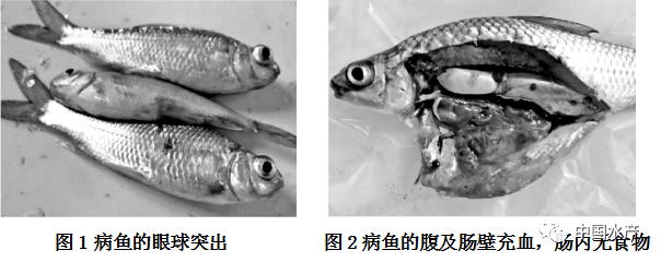 该病由病原产生毒素,引起鱼体溶血、出血、组织严重坏死,最后导致死亡。疾病早期及急性感染时,病鱼出现上下颌、口腔、鳃盖、眼睛及鱼体两侧轻度充血,此时病鱼食欲减退。疾病严重时部分鱼因眼眶充血而出现突眼(图1),鳞片竖起等症状。剖检时,病鱼全身肌肉因充血而成红色,腹腔内积有黄色或血红色腹水,肝、脾、肾脏肿胀,肠壁充血,肠道内无食物(图2),部分鱼鳃色浅,呈贫血状。
