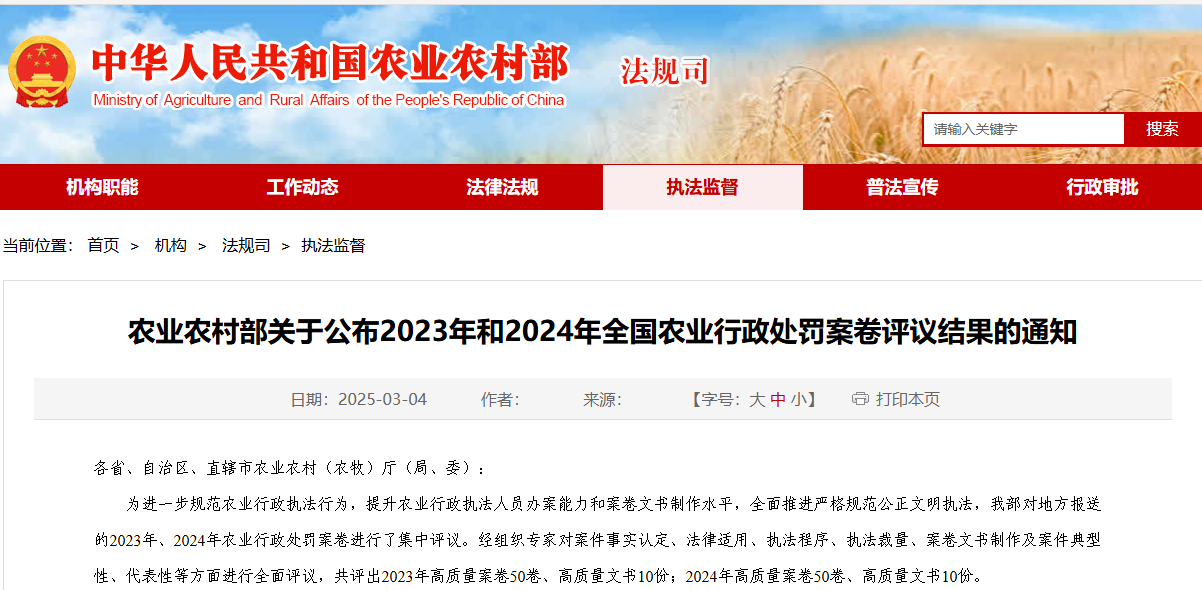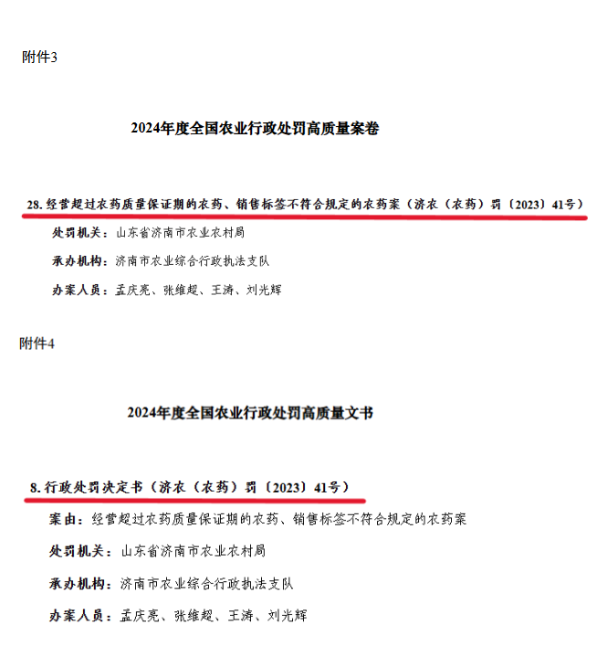 近日,农业农村部对地方报送的2023年、2024年农业行政处罚案卷进行了集中评议,济南市农业综合行政执法支队承办的“经营超过农药质量保证期的农药、销售标签不符合规定的农药案(济农(农药)罚〔2023〕41号) ”被评为2024年度全国农业行政处罚高质量案卷和全国农业行政处罚高质量文书。