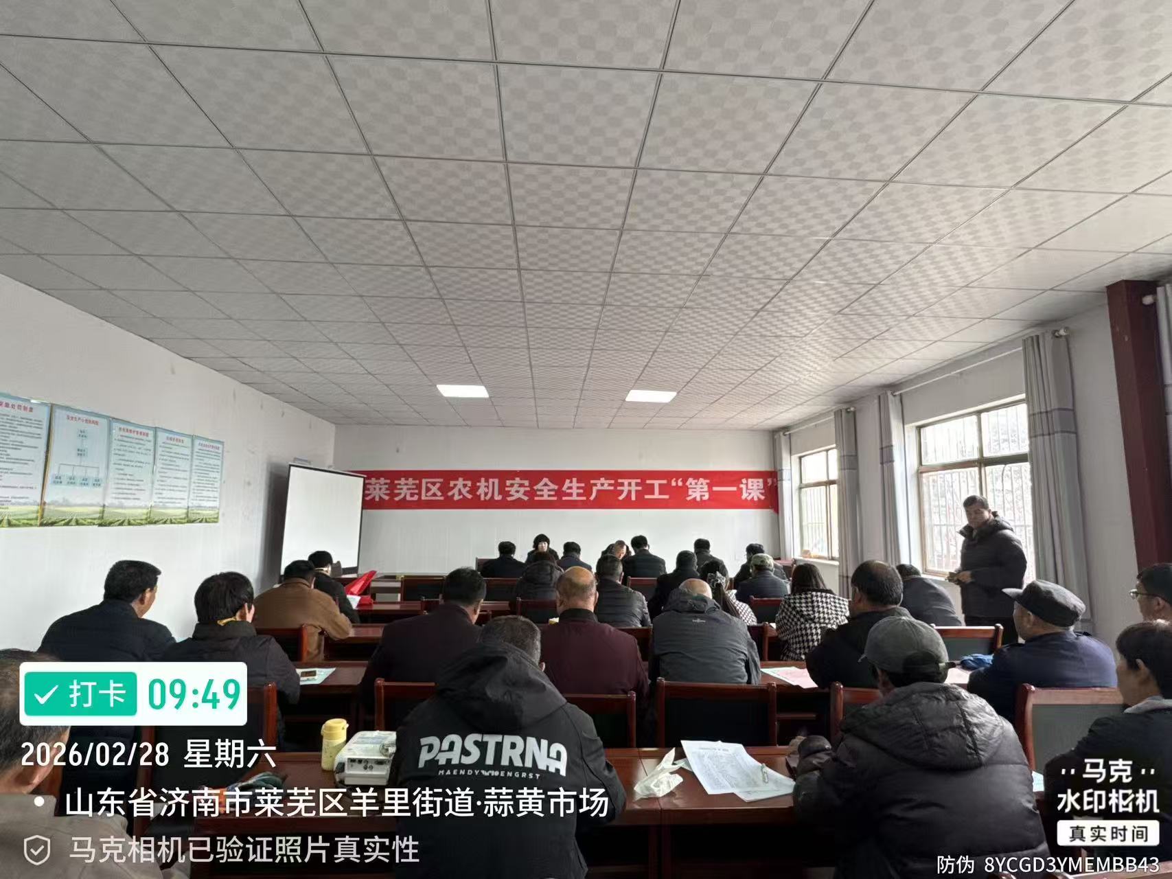 莱芜区农业农村局在羊里街道安太农事综合服务中心举办2026年农机安全开工“第一课”,全区主要农机服务组织、农机经销单位负责人及部分农机手共30余人参加培训。