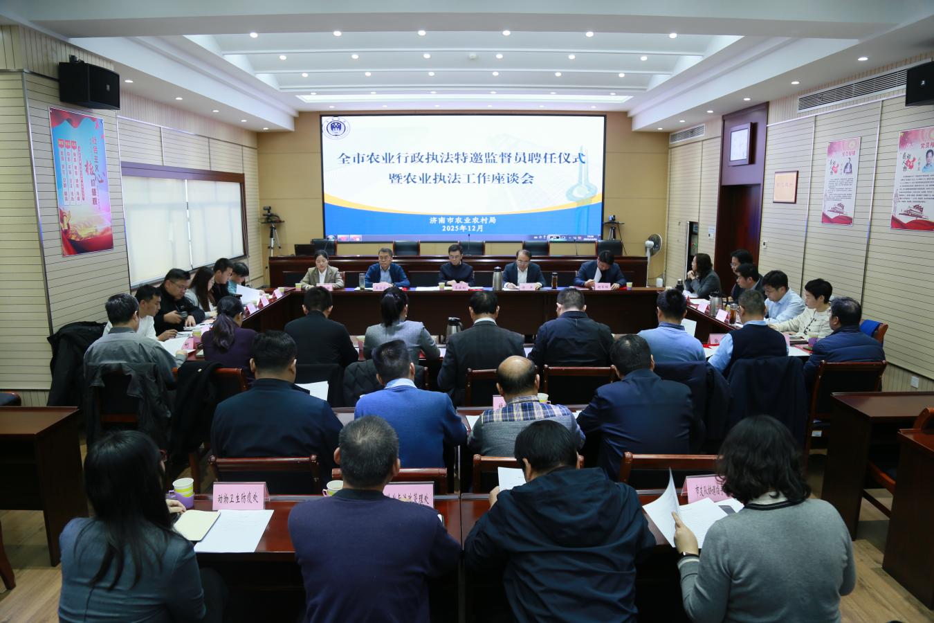 为进一步拓宽农业农村领域行政执法监督渠道,规范涉企行政执法,优化法治化营商环境,12月24日,济南市农业农村局举办全市农业行政执法特邀监督员聘任仪式暨农业执法工作座谈会。局党组副书记、副局长高振刚出席并讲话,局党组成员、正处级领导干部许平主持会议,市农业综合行政执法支队支队长王守宽、市司法局行政执法监督处副处长谢军辉出席会议。本次活动选聘首批45名农业行政执法特邀监督员,入选人员涉及种植业、种业、律师等多个行业和领域。会议通报了全市农业综合行政执法工作情况,宣读了农业行政执法特邀监督员、企业联系点名单及其工作职责,交流探讨涉企农业执法工作。