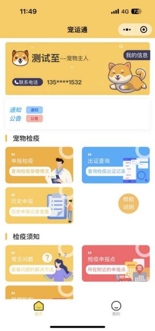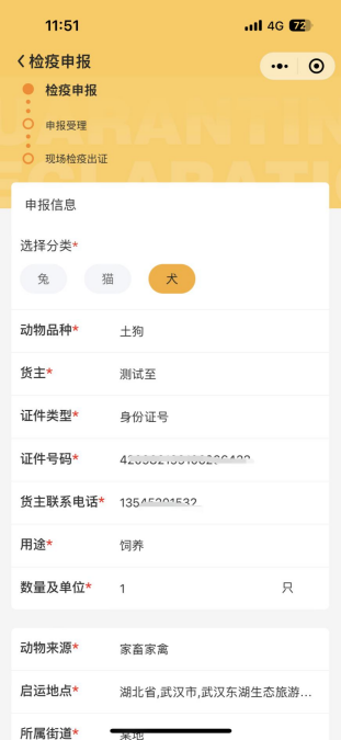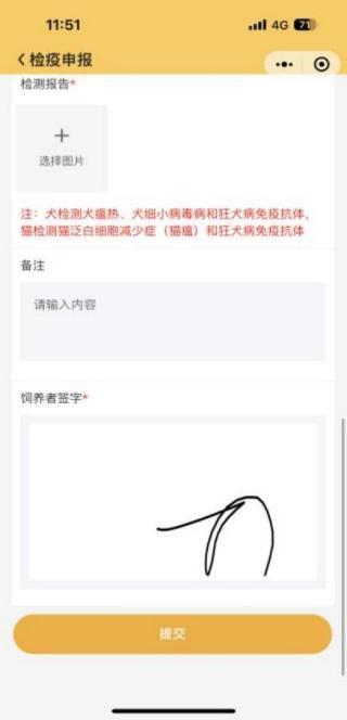 宠物主人可进行申报检疫操作,点击宠物检疫-申报检疫栏进行检疫申报:填写打红色*的必填信息,完成后提交。